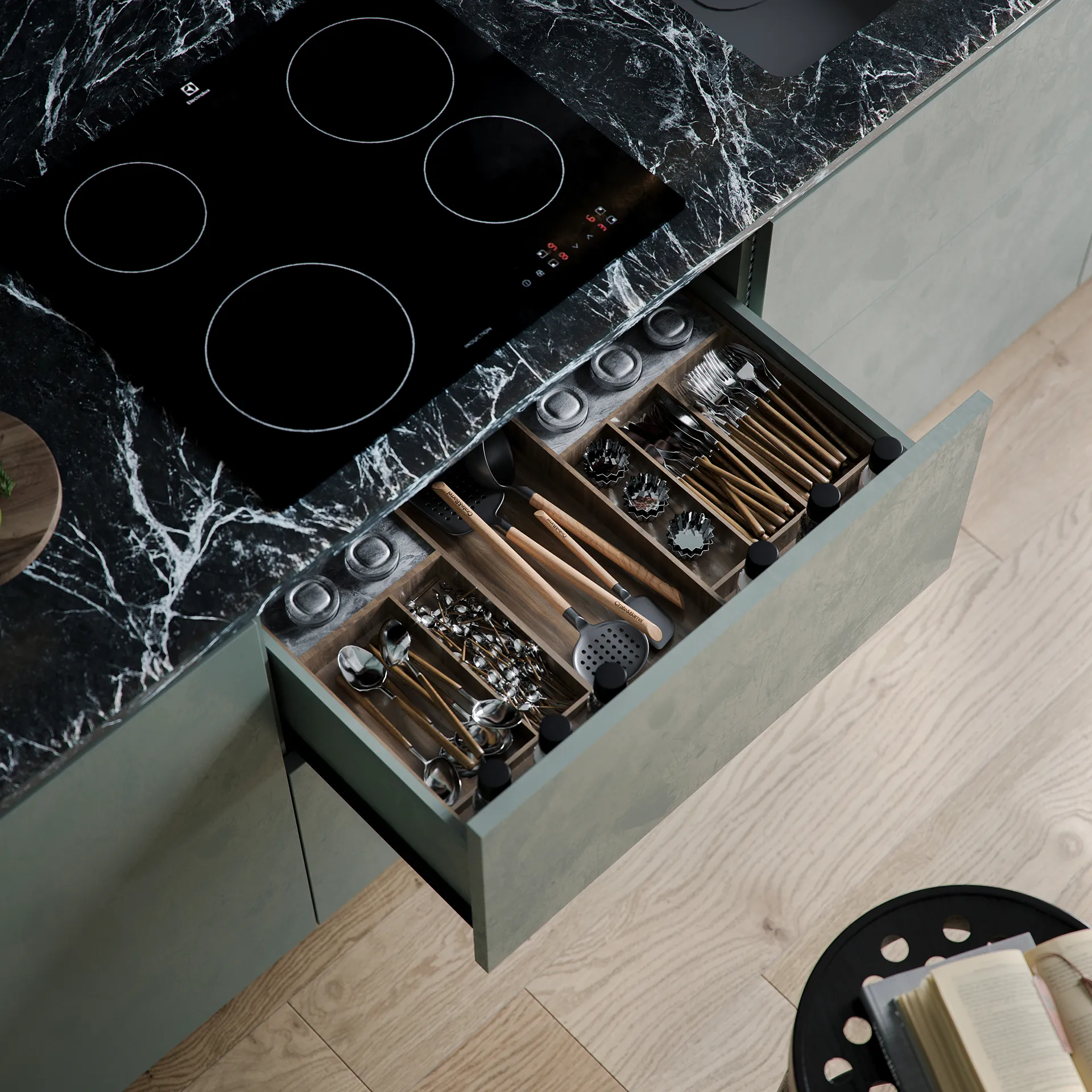 Le cucine SCIC, su misura per ogni appartamento, incarnano la cura per ogni dettaglio, con materiali di alta qualità e un'estetica senza tempo.
