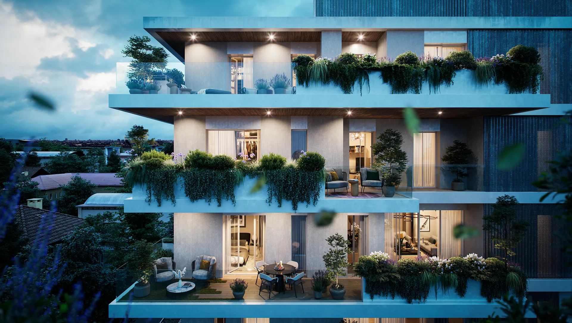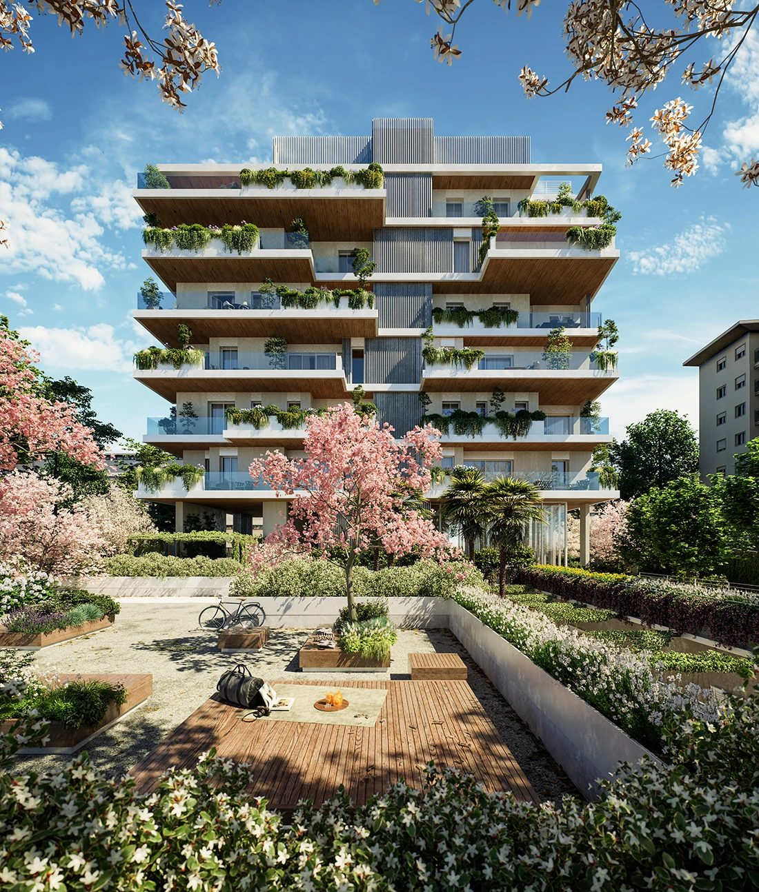 Questo progetto esclusivo si distingue per la sua facciata moderna, giardini pensili abitabili e ampie finestre che regalano una luminosità senza pari.